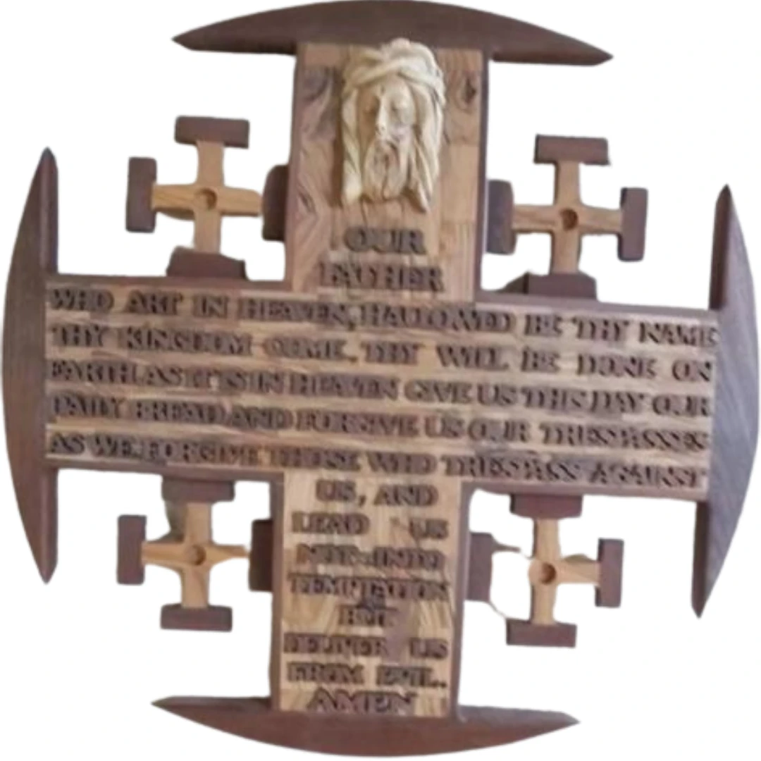 Express your deep faith with this exquisite 50 cm Jerusalem Cross, handcrafted from natural olive wood in Bethlehem, the sacred birthplace of Jesus Christ. This unique cross features the iconic Jerusalem Cross design—a large central cross surrounded by four smaller crosses—symbolizing the spread of the Gospel to the four corners of the earth. It is beautifully engraved with the complete Lord’s Prayer ("Our Father"), serving as a daily reminder and source of spiritual reflection. ✅ 100% Natural Olive Wood: ✅ Handmade in Bethlehem: ✅ Complete Lord’s Prayer Engraving: ✅ Authentic Jerusalem Cross Design: ✅ Perfect for Display or Gift: