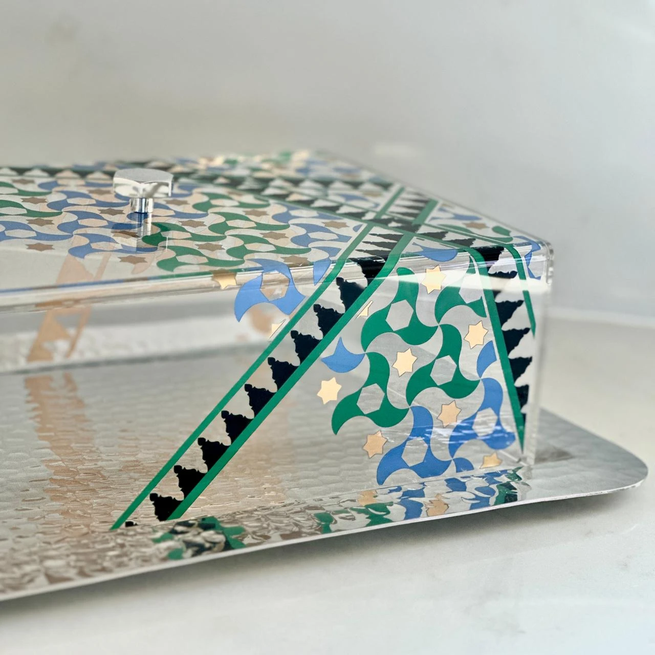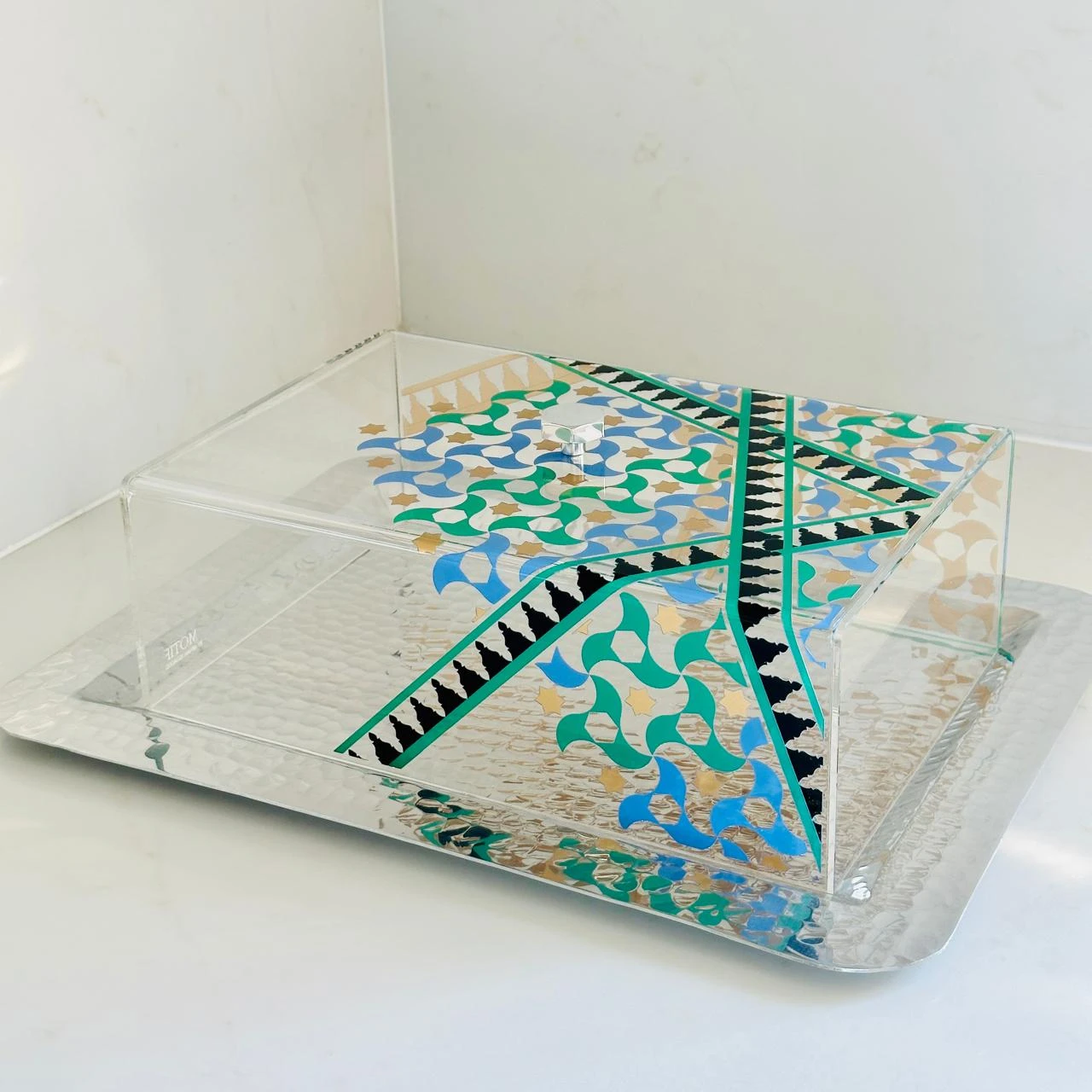 Alicatado Silver Platter with Cover – Handmade Hammered Aluminum Tray with Clear Plexiglass Lid – Inspired by Alhambra Tile Patterns