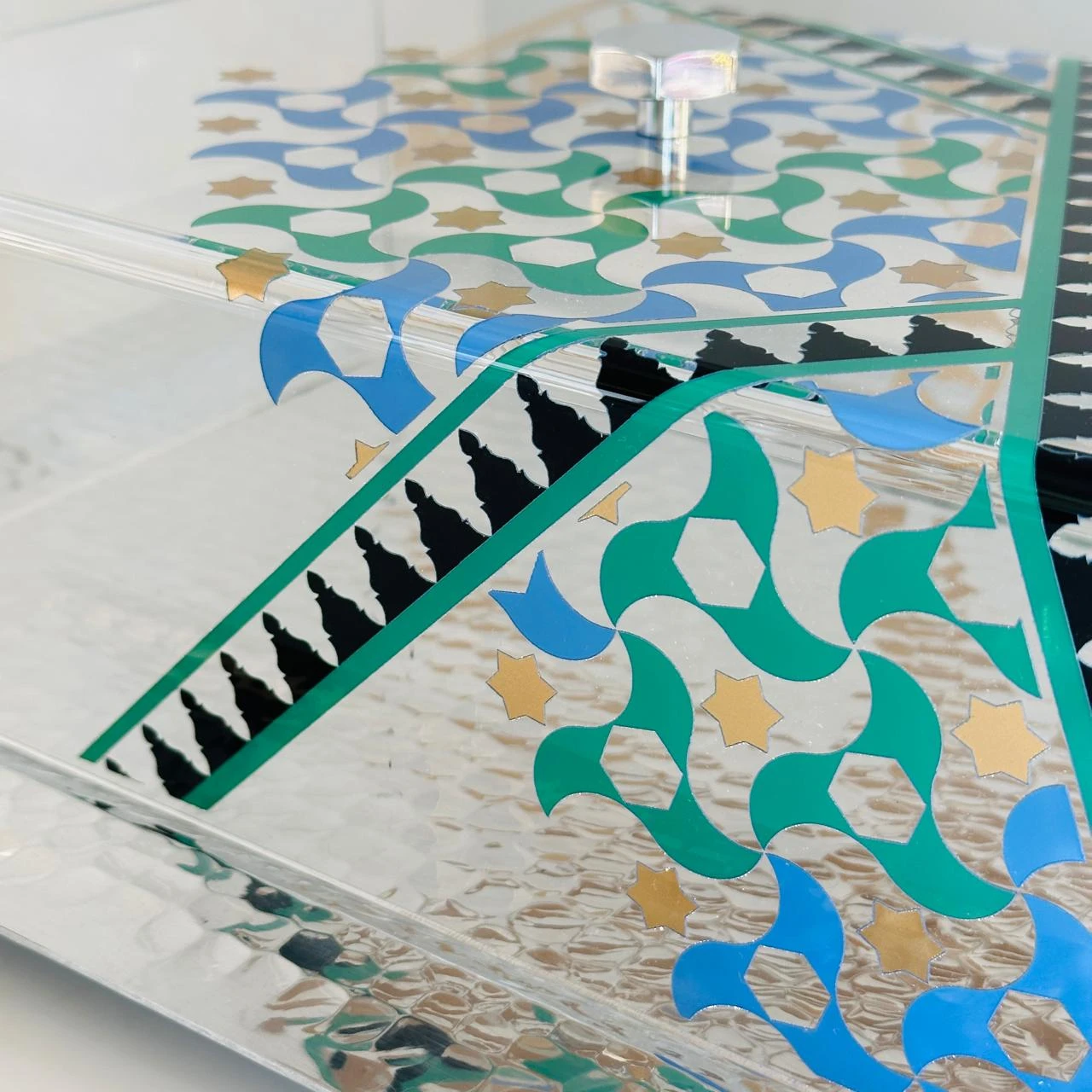 Add a touch of heritage and elegance to your table with this handcrafted Alicatado silver platter with cover. Made from hammered aluminum and topped with a clear plexiglass lid, this unique piece draws inspiration from the intricate Alicatado tile patterns of the Nasrid palaces in Alhambra, Granada. The centerpiece of the design is the iconic three-pointed swirl motif, known as pajarita, echoing the rich geometric artistry of 14th-century Moorish Spain.