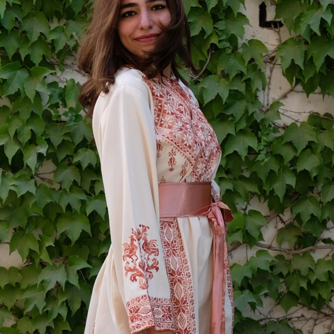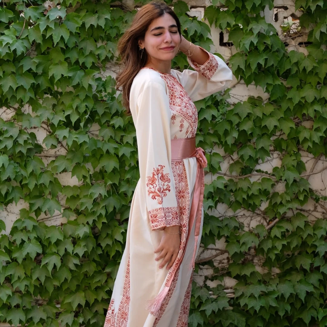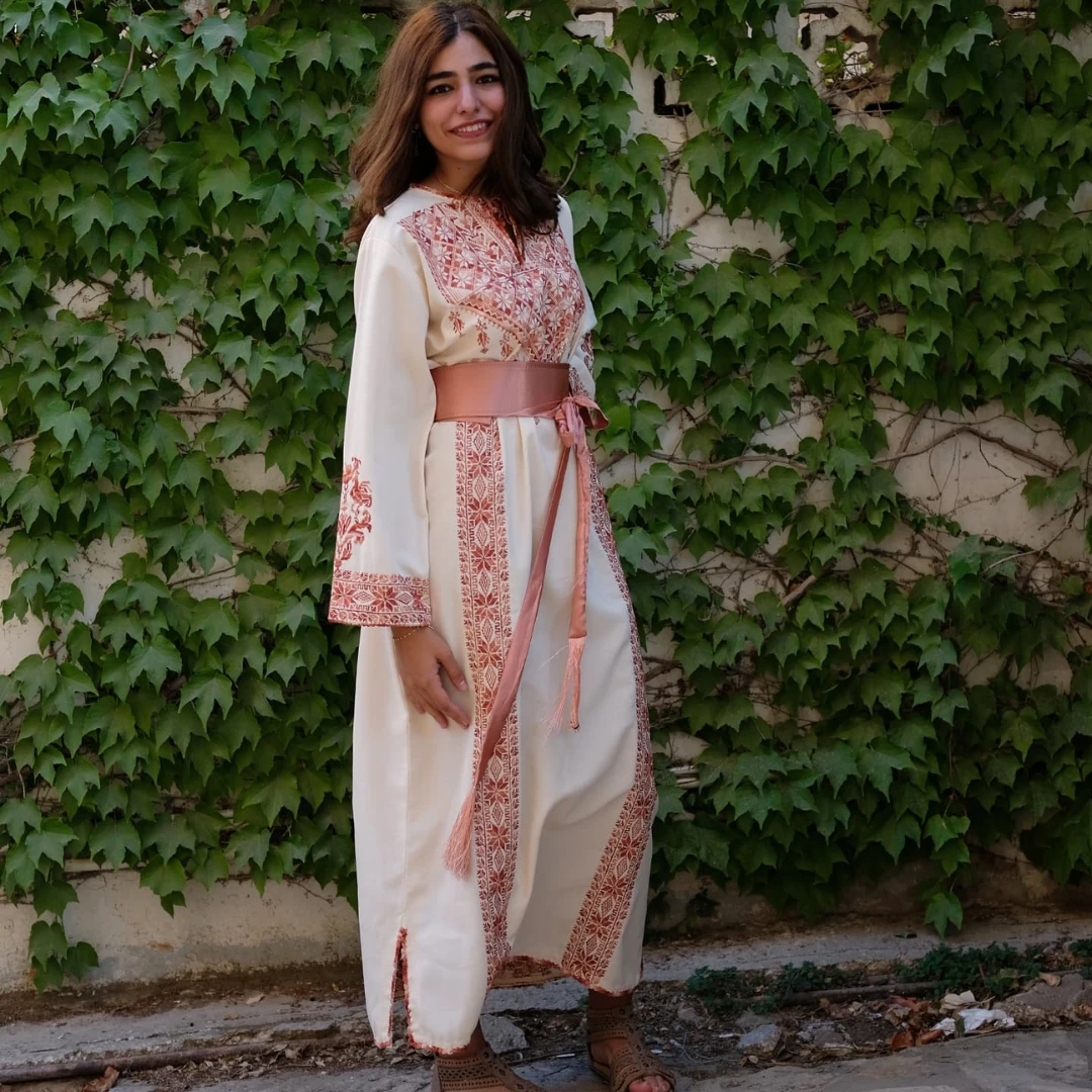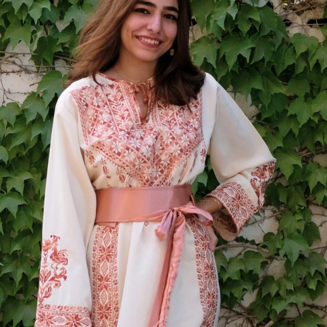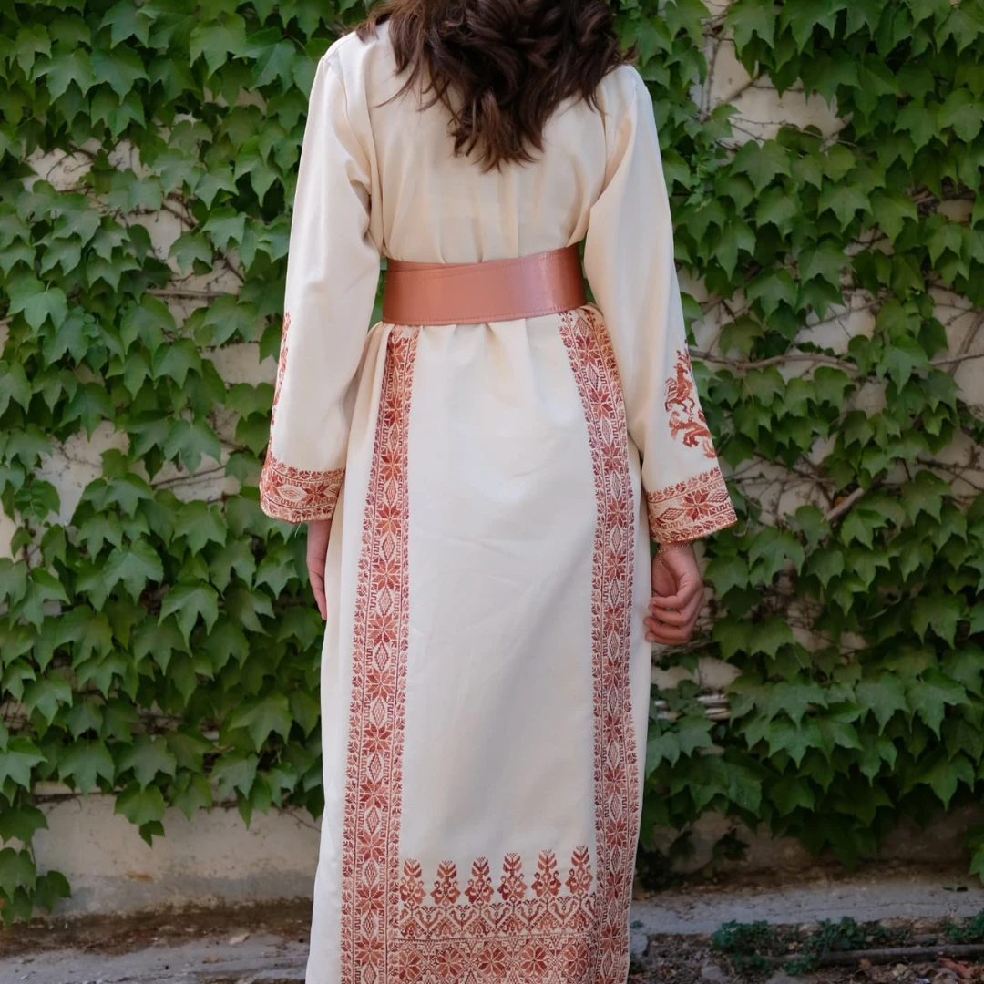 Discover a unique piece of Palestinian heritage: a hand-embroidered thobe featuring four “Hebron Stars” and fine “Reesh” thread, originating from the fertile village of Aqir in the Ramle district.