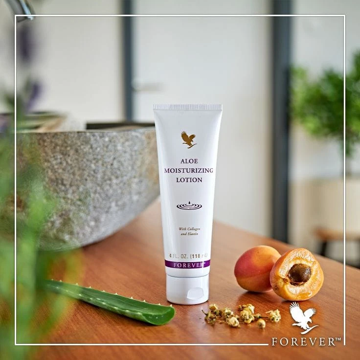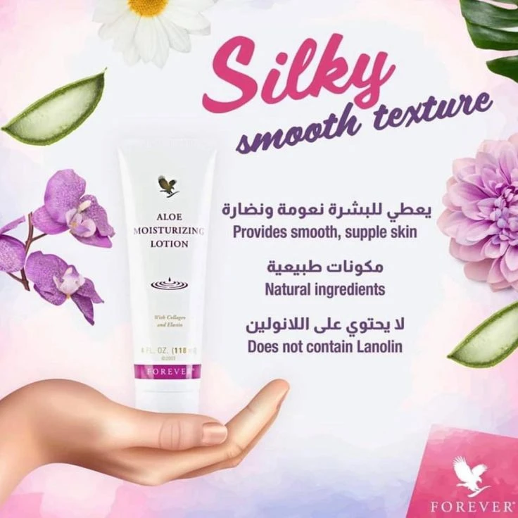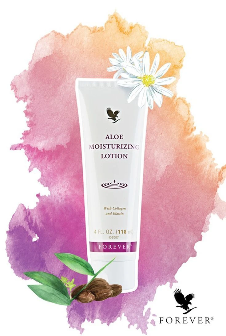 A rich and silky moisturizing lotion that combines the natural power of aloe vera with skin-supporting ingredients like collagen and elastin. Packaged in an elegant white bottle with gold and purple accents, reflecting the purity of the formula and the luxury of skincare.