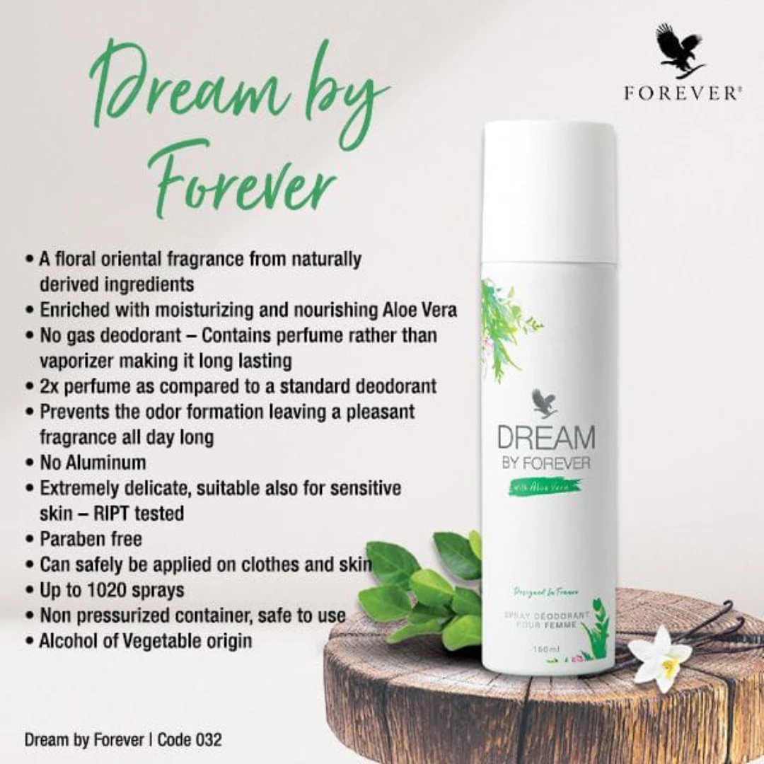 Discover Forever Dream, a luxurious deodorant spray for women that combines a floral oriental fragrance with natural ingredients for all-day freshness and reliable protection against odor. Enriched with aloe vera gel, known for its moisturizing and nourishing properties, this gentle formula is safe even for sensitive skin, leaving you feeling refreshed, confident, and comfortable throughout the day.