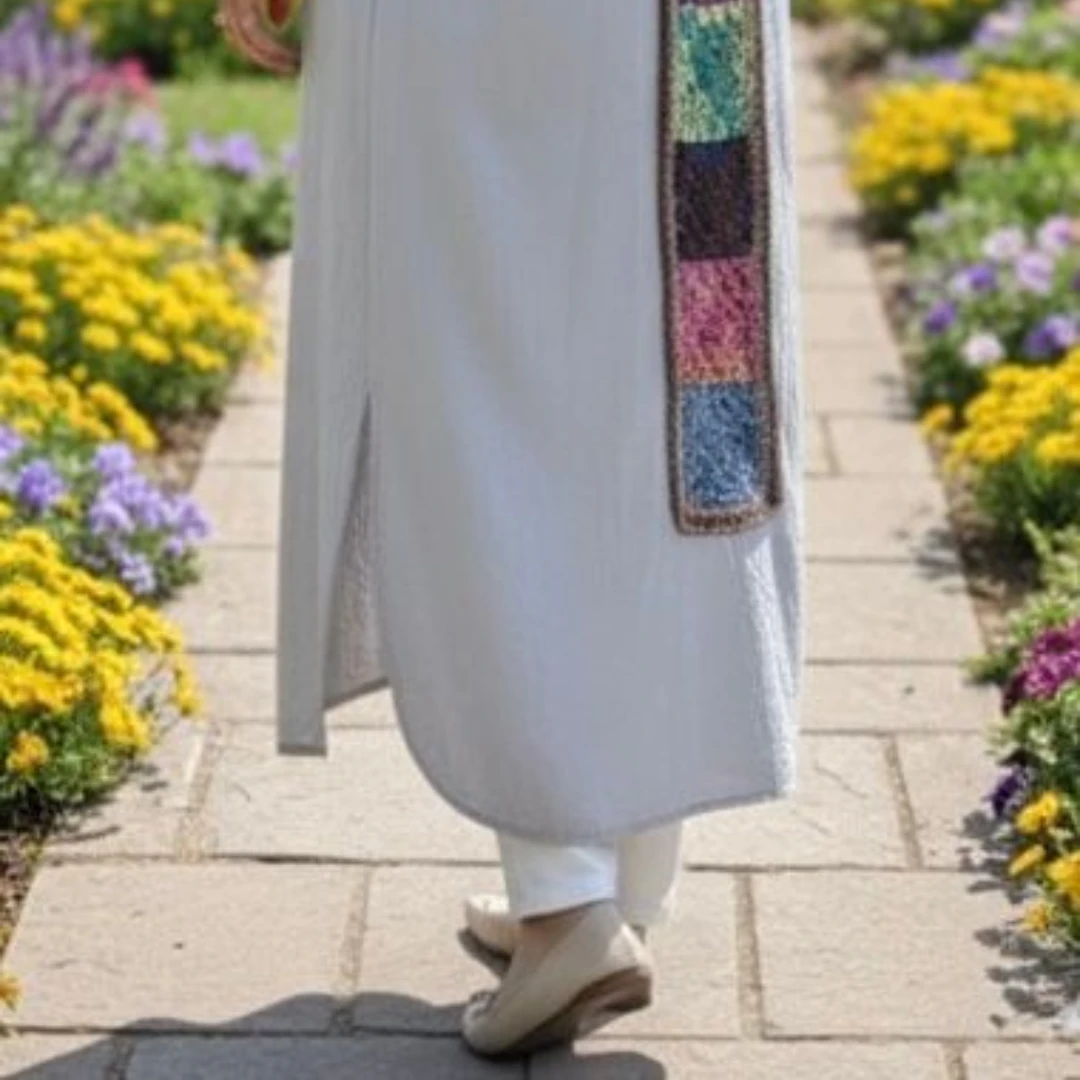 Step into timeless elegance with this sleeveless abaya in a soft, light silver-gray hue. Designed for the modern woman who appreciates artisanal detail, it features a striking vertical stripe of crochet squares running down the center back. Each square showcases a blend of muted earth tones—deep pinks, dusty blues, and sage greens—beautifully framed by a dark brown border, creating a sophisticated, bohemian statement. With its flowing silhouette and intricate craftsmanship, this abaya is perfect for adding a refined yet artistic touch to any occasion. Specifications: