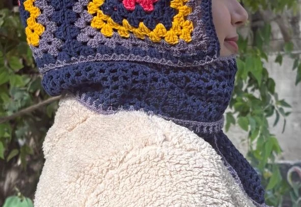 Description: Add a retro-inspired pop of color to your winter wardrobe with this handcrafted crochet hooded scarf. Featuring a striking graphic square pattern in deep navy, vibrant mustard yellow, and gray, accented by a bright hot pink center, it combines warmth, style, and playful artistry. Perfect for layering, this scarf transforms any outfit into a cozy, eye-catching statement. Specifications:Design: Hooded scarf with bold, graphic crochet squares Why You’ll Love It:✔ Handcrafted crochet with vibrant, retro-inspired colors |