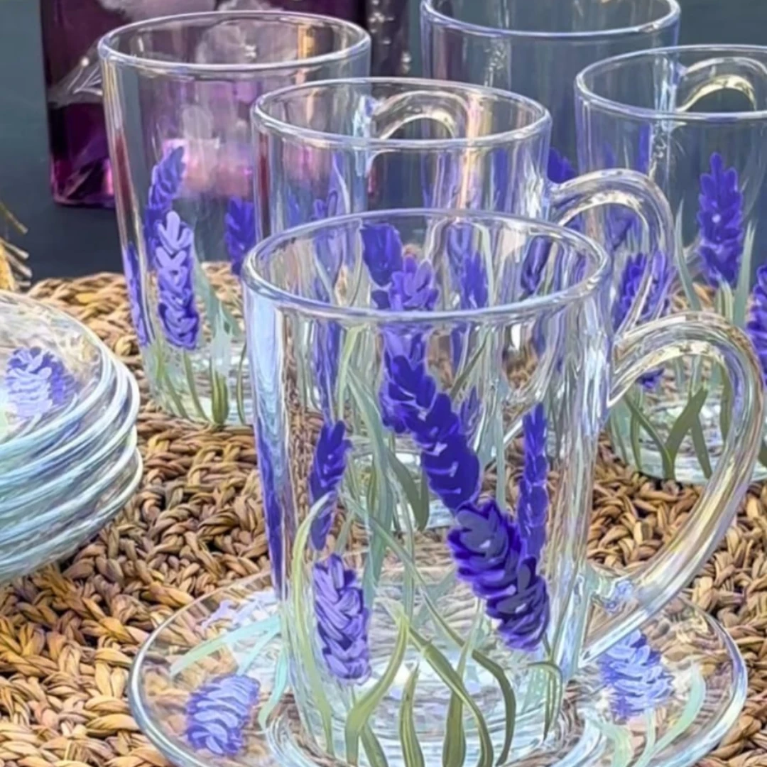 Enjoy a calming and elegant tea experience with this beautiful set, featuring 6 tea glasses and matching saucers, decorated with a delicate lavender flower design 🪻🪻🪻 ✨ Features: