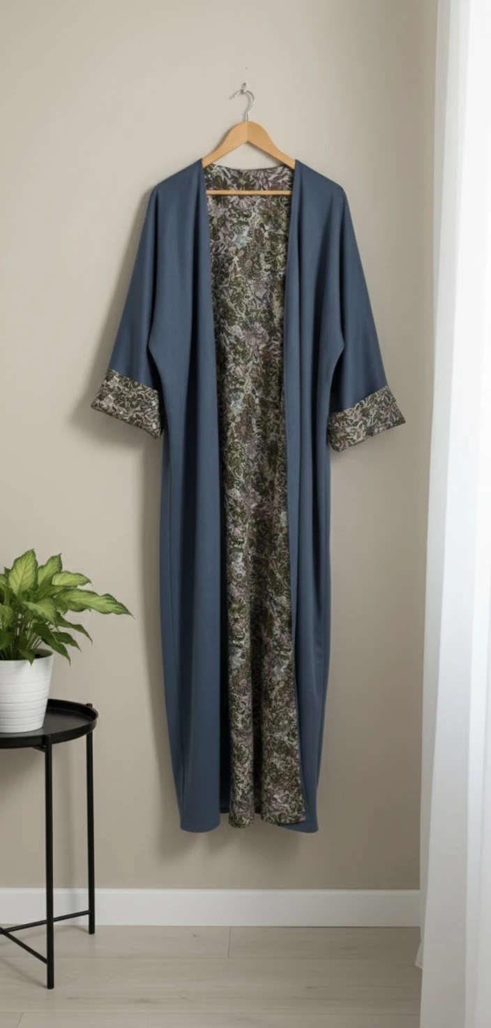 Redefine daily elegance with this minimalist mahogany abaya, where hidden details reveal a world of tradition. The body is made from a smooth, structured crepe fabric in a rich mahogany shade, offering a clean, modern foundation for everyday wear. The hidden beauty lies in the intricate paisley lining that peeks through the open front and adorns the wide, turned-back cuffs. This subtle use of a traditional "Buta" pattern adds a layer of depth and sophistication to an otherwise understated garment, making it the perfect choice for the modern professional or stylish traveler. Specifications: