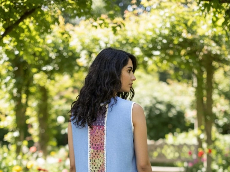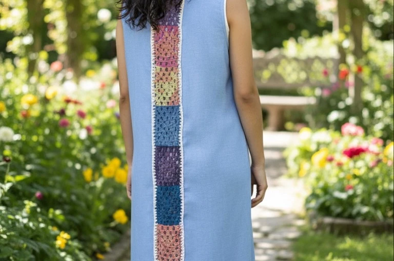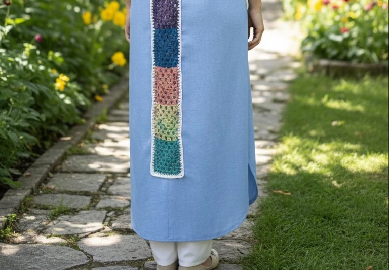 Description: Step into artisanal elegance with this long, sleeveless abaya in soft sky blue. Its centerpiece is a vertical stripe of handcrafted crochet squares, showcasing a rich palette of pink, yellow, blue, and deep purple, all framed by a crisp white border. The vibrant design transforms a simple flowing silhouette into a striking, colorful statement piece—perfect for a chic, summery look. Specifications:Design: Sleeveless abaya with vertical crochet back panel Why You’ll Love It:✔ Handcrafted crochet detailing adds vibrant, artisanal charm |