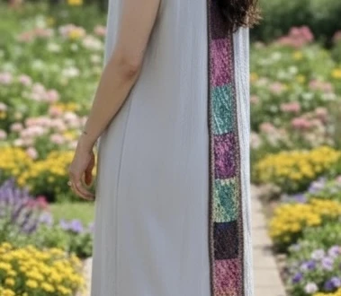 Step into timeless elegance with this sleeveless abaya in a soft, light silver-gray hue. Designed for the modern woman who appreciates artisanal detail, it features a striking vertical stripe of crochet squares running down the center back. Each square showcases a blend of muted earth tones—deep pinks, dusty blues, and sage greens—beautifully framed by a dark brown border, creating a sophisticated, bohemian statement. With its flowing silhouette and intricate craftsmanship, this abaya is perfect for adding a refined yet artistic touch to any occasion. Specifications: