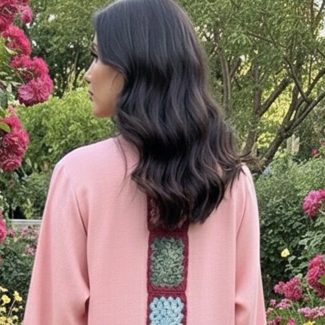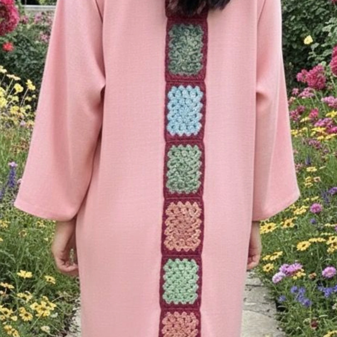 Pink Crochet Abaya (back) – Elegant & Modern Design Description:Add a touch of charm and color to your wardrobe with this elegant abaya in a soft salmon pink hue. Its standout feature is the vertical panel of handcrafted crochet squares running down the center back, creating a beautiful contrast against the solid fabric. The vibrant crochet details bring a hint of artistry and warmth to the refined silhouette, making it perfect for both everyday elegance and special occasions. Specifications: