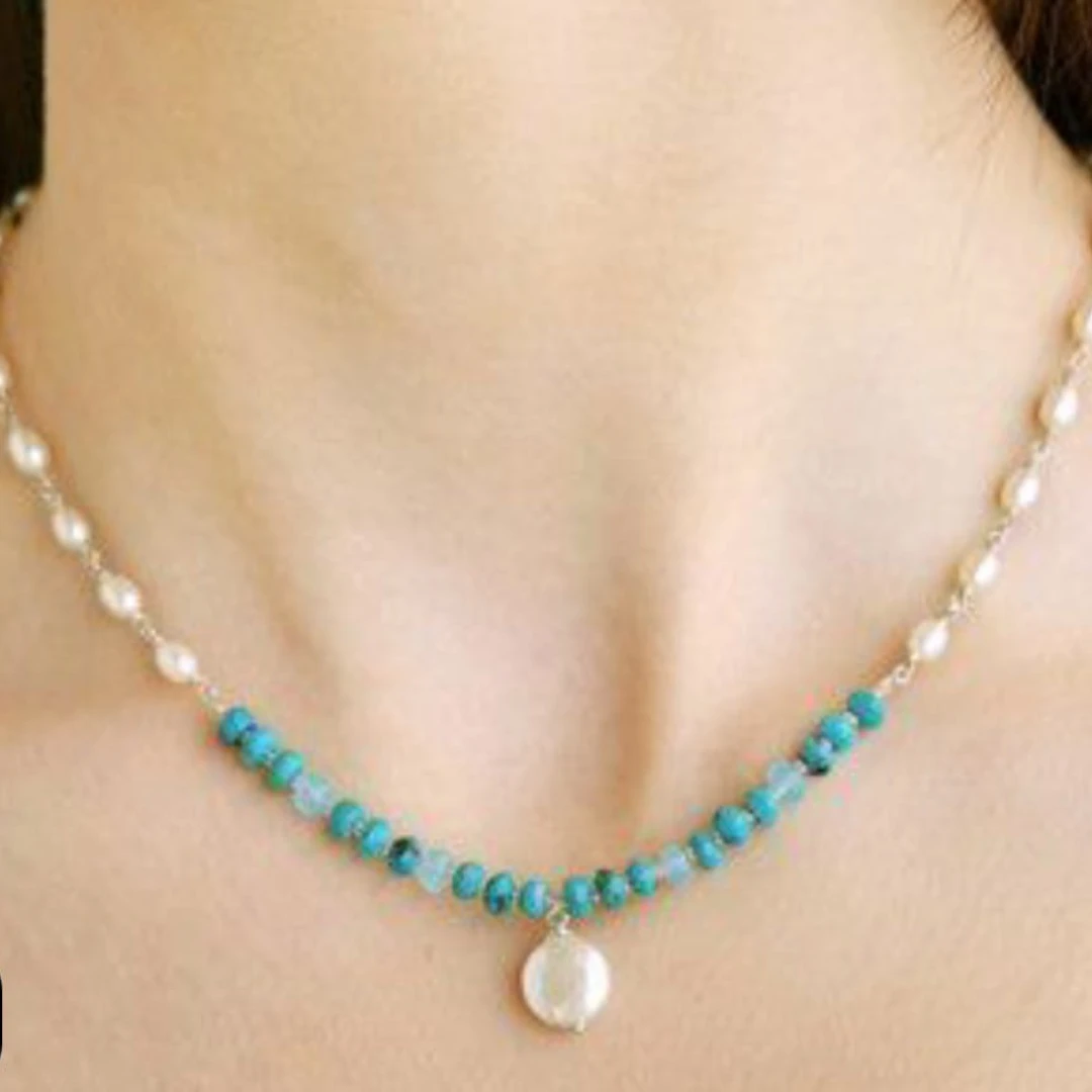 Natural Turquoise and Pearl Necklace – Elegant Fusion of Ocean Serenity and Gemstone Beauty