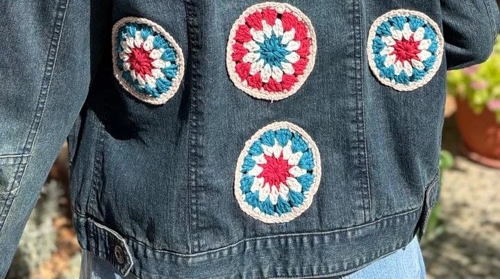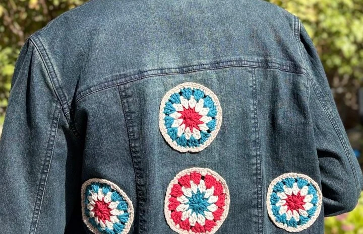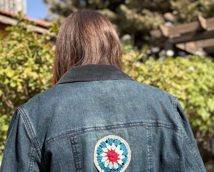 Symmetrical Mandala Crochet Denim Jacket – Artistic & Bold Design Description:Make a statement with this handcrafted denim jacket featuring a beautifully symmetrical mandala design. The darker denim base provides the perfect canvas for five circular crochet patches in striking shades of red, teal, and cream. Each mandala is carefully placed to create a balanced, eye-catching composition that blends artistry with modern street style. Perfect for those who love unique, expressive fashion with a handmade touch. Specifications:Design: Dark denim jacket with five crochet mandala patches Why You’ll Love It:✔ Unique handcrafted mandala patches with bold color contrast |