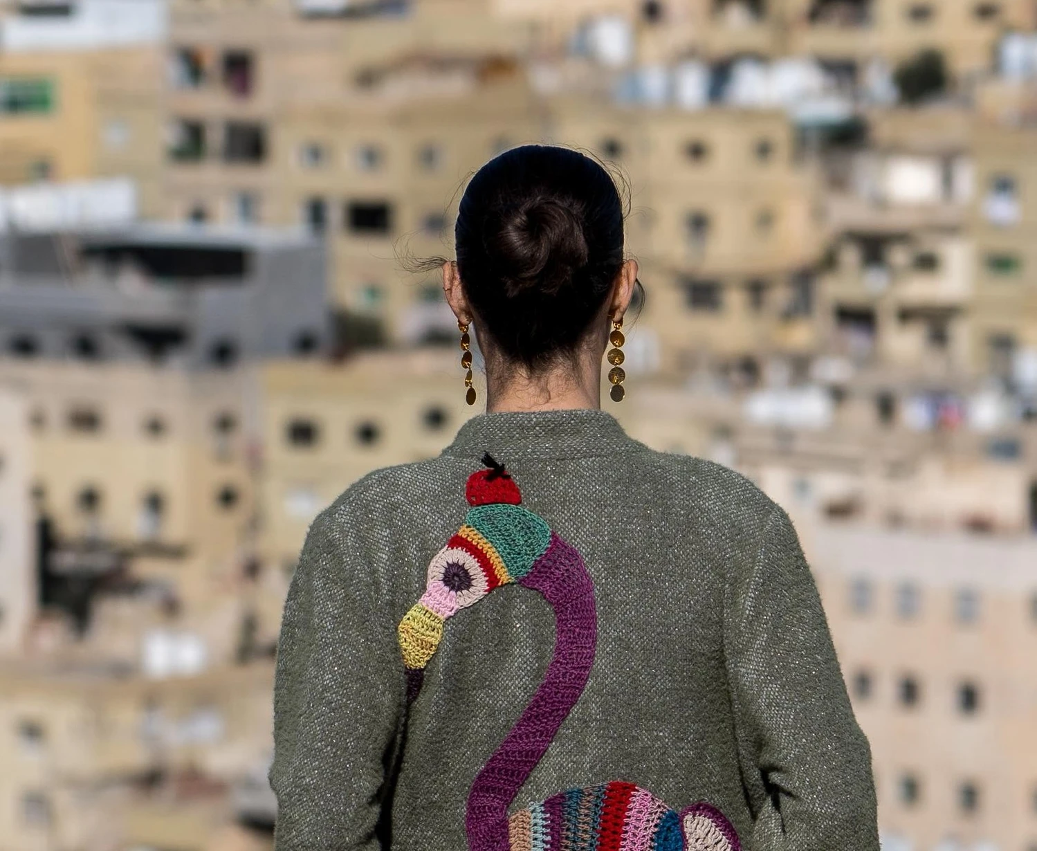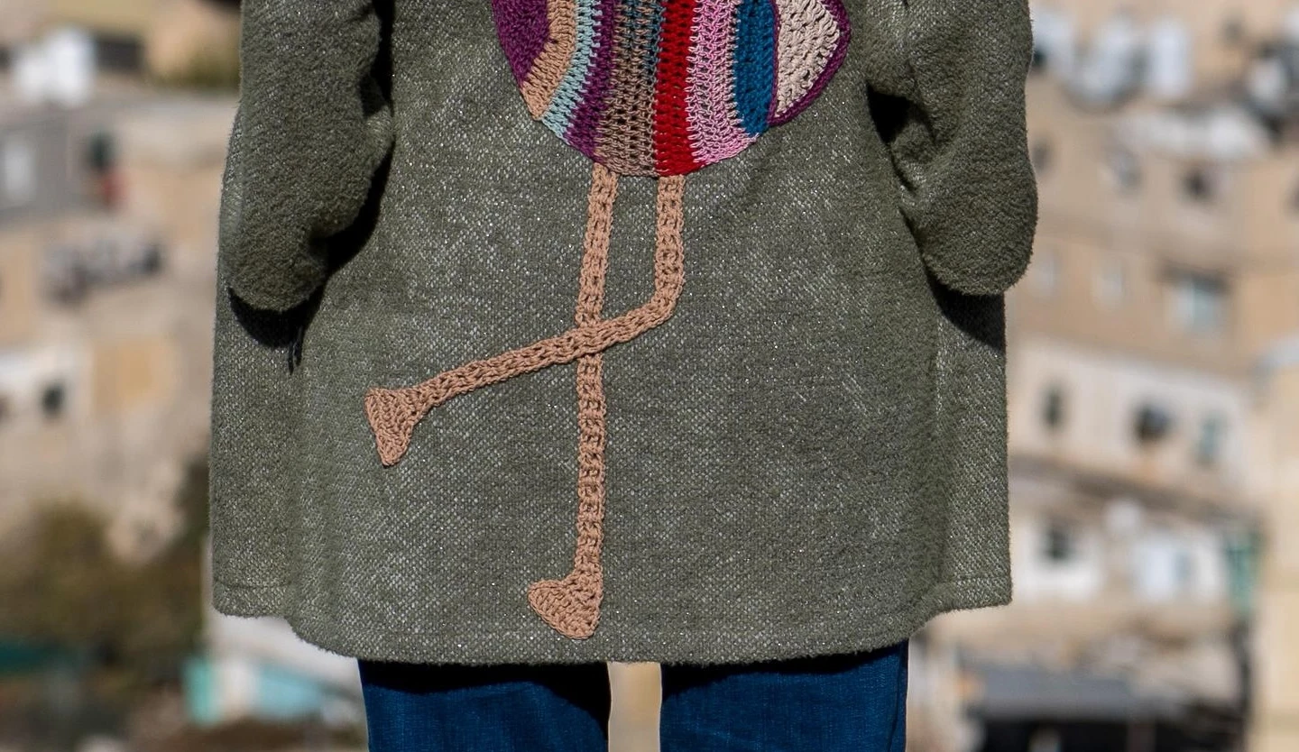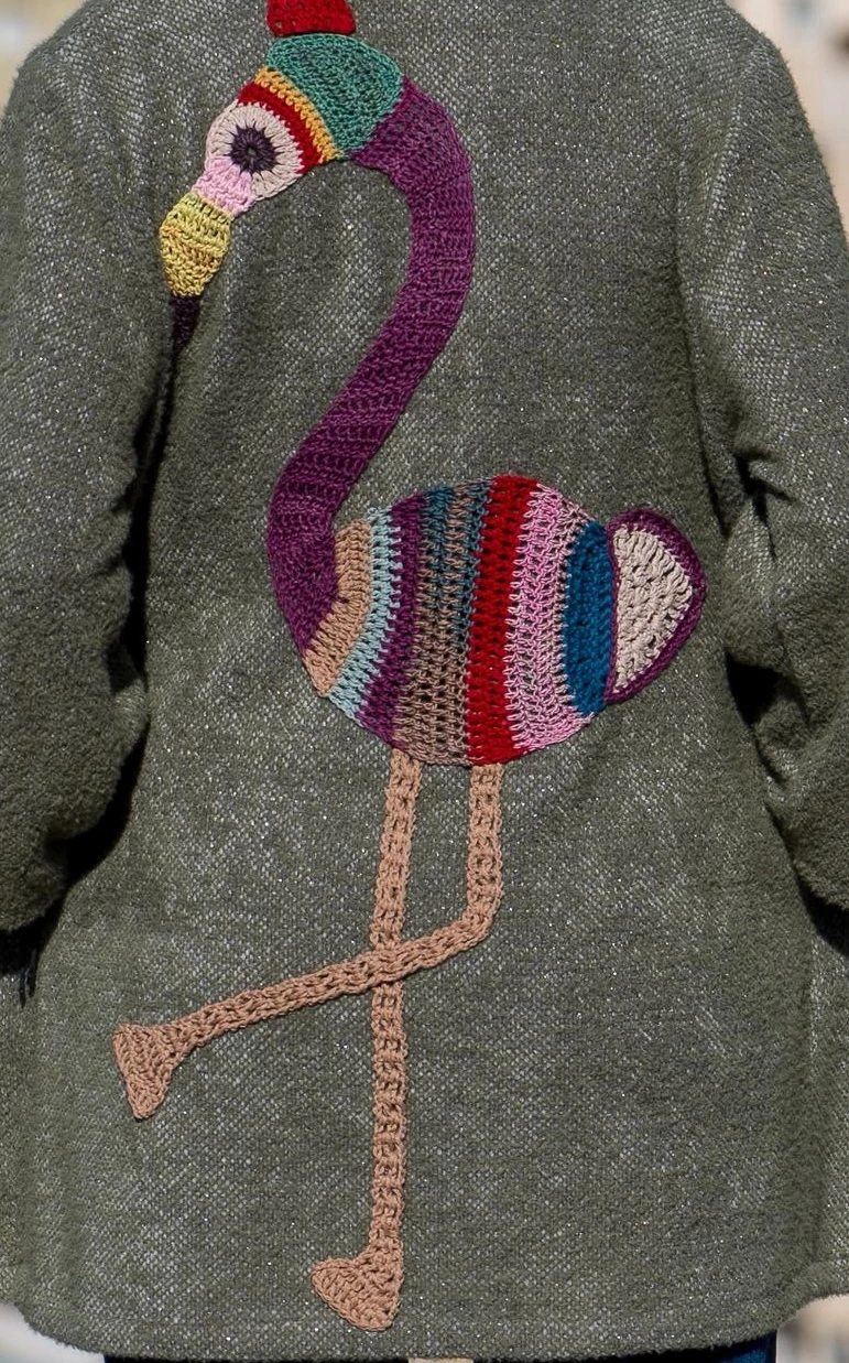 Description: Turn heads with this one-of-a-kind mohair-blend jacket in cozy khaki/sage green. The standout feature is a large, hand-appliquéd and crocheted flamingo on the back, showcasing vibrant colors and intricate craftsmanship. This luxurious piece blends wearable art with playful, whimsical style, making it perfect for layering over jeans and a simple top. Make a bold statement with every step and let your back become a masterpiece. Specifications:Design: Mohair-blend jacket with hand-appliquéd/crocheted flamingo on the back Why You’ll Love It:✔ Hand-appliquéd flamingo adds bold, whimsical artistry |